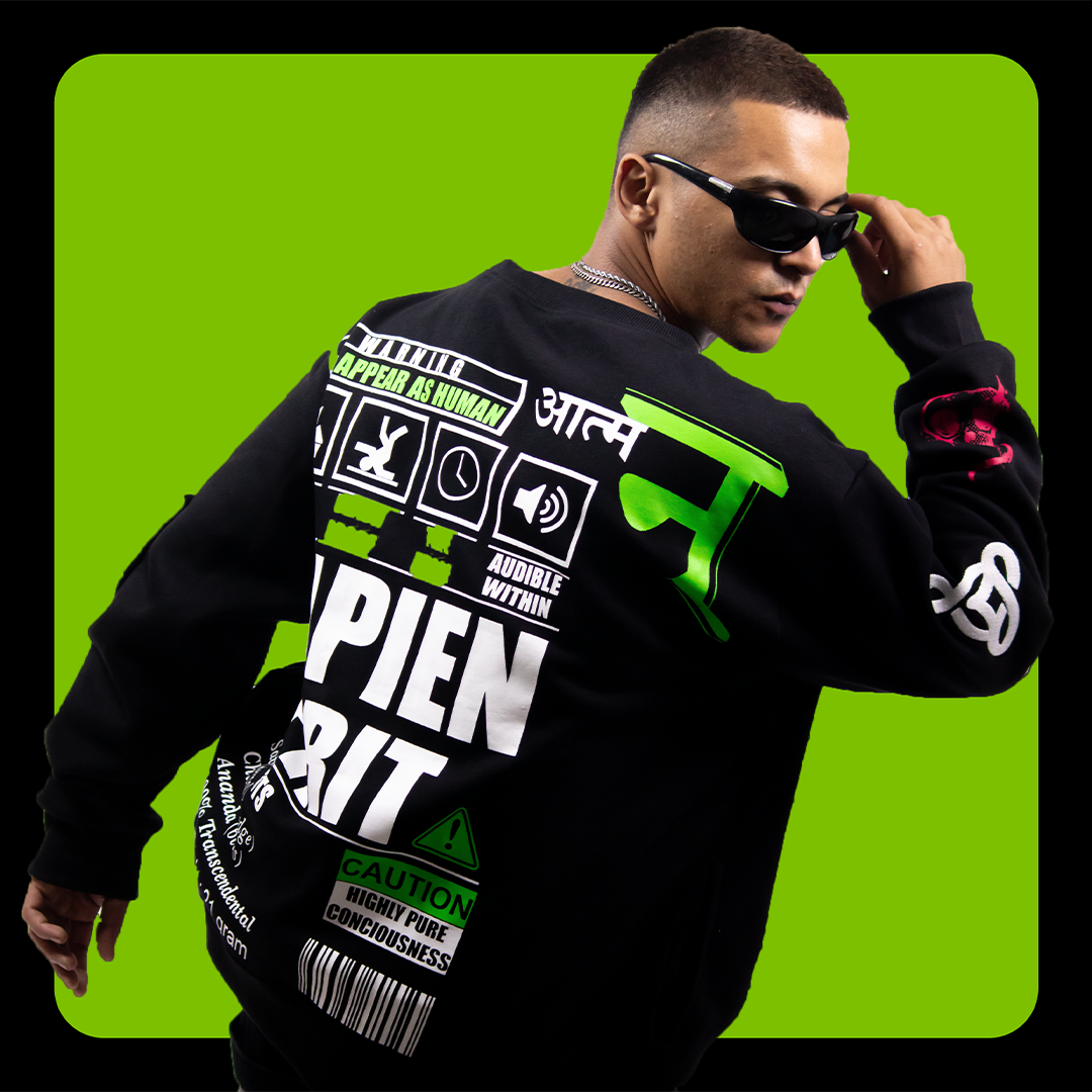 Additionally, on the back of the sweatshirt, bold yet refined typography spells out the Sapien Spirit Content. Furthermore, this poetic description highlights the essence of the soul: Sat Chit Ananda—truth, consciousness, and bliss. Moreover, these Sanskrit concepts form the foundation of spiritual philosophy, reminding us of our higher purpose and the universal quest for eternal happiness.
