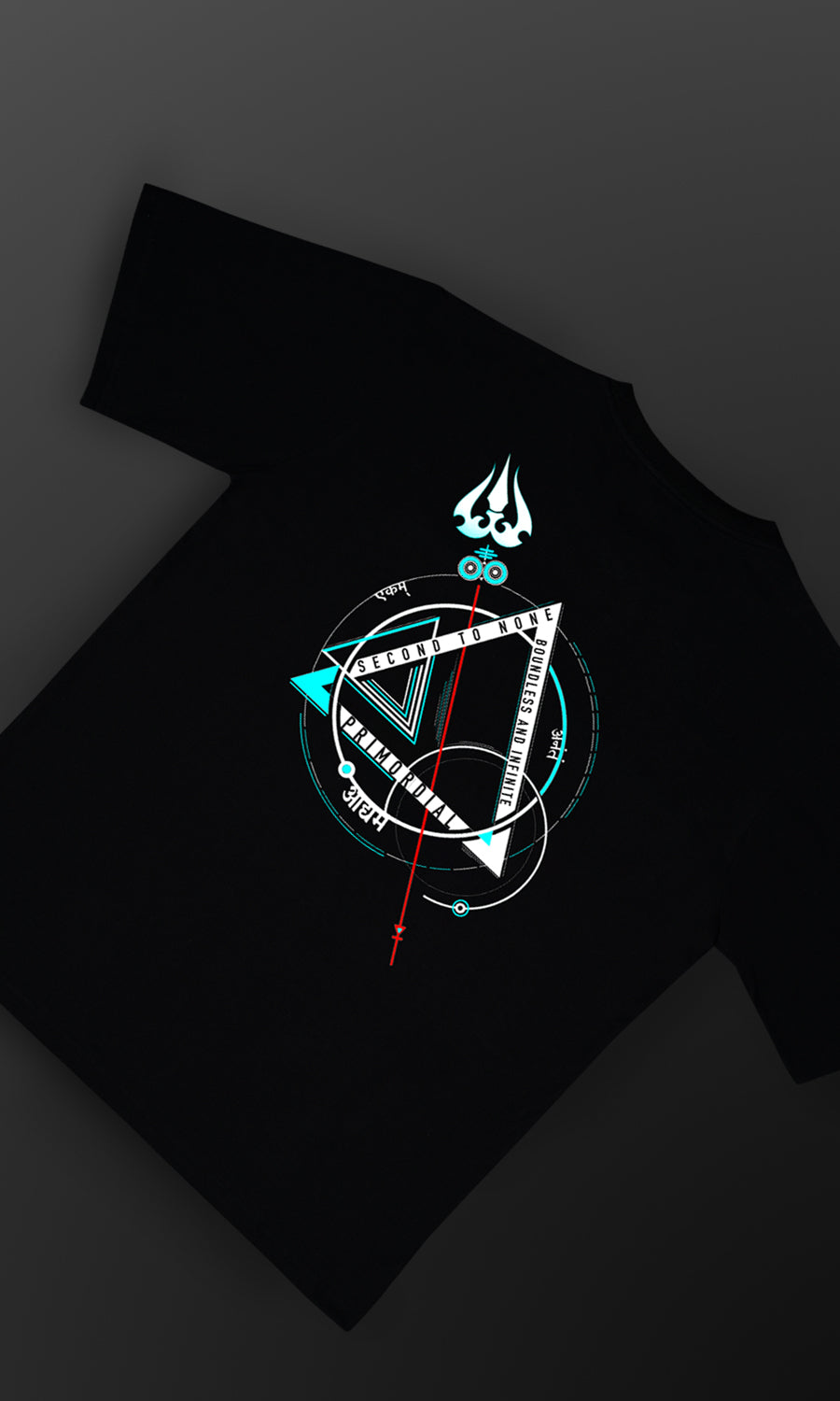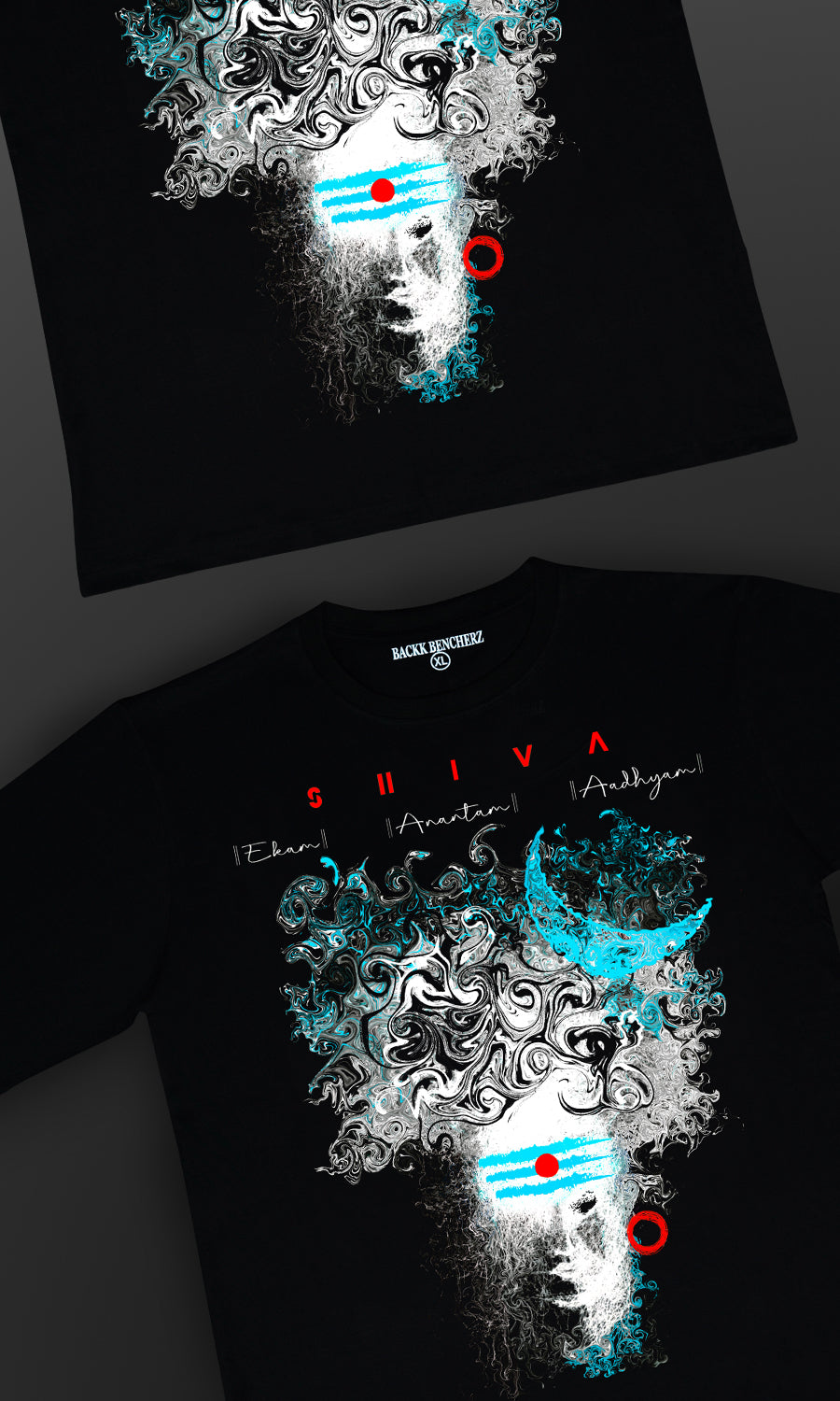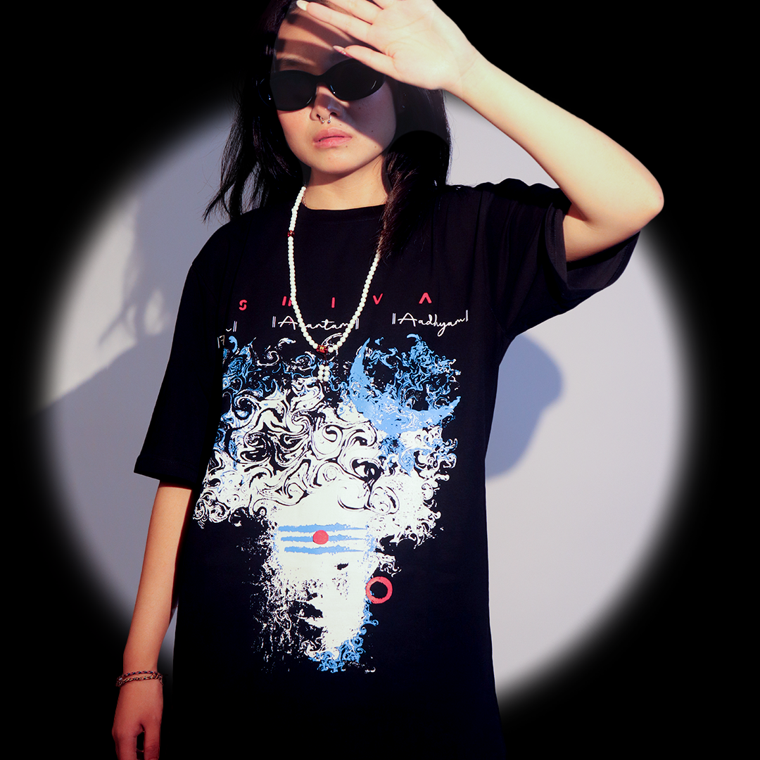 Shiva, the Hindu deity of destruction and transformation, transcends earthly boundaries, embodying the essence of the cosmos itself. Within the sacred trinity of Hinduism, Shiva is revered as Ekam, the primordial one; Aadhyam, the one second to none; and Anantam, the one without an end. Through a captivating t-shirt design featuring Shiva with open dreadlocks, the artist invites us to delve into the depths of divine symbolism and spiritual enlightenment, exploring the eternal nature of existence and the boundless energy of the universe.