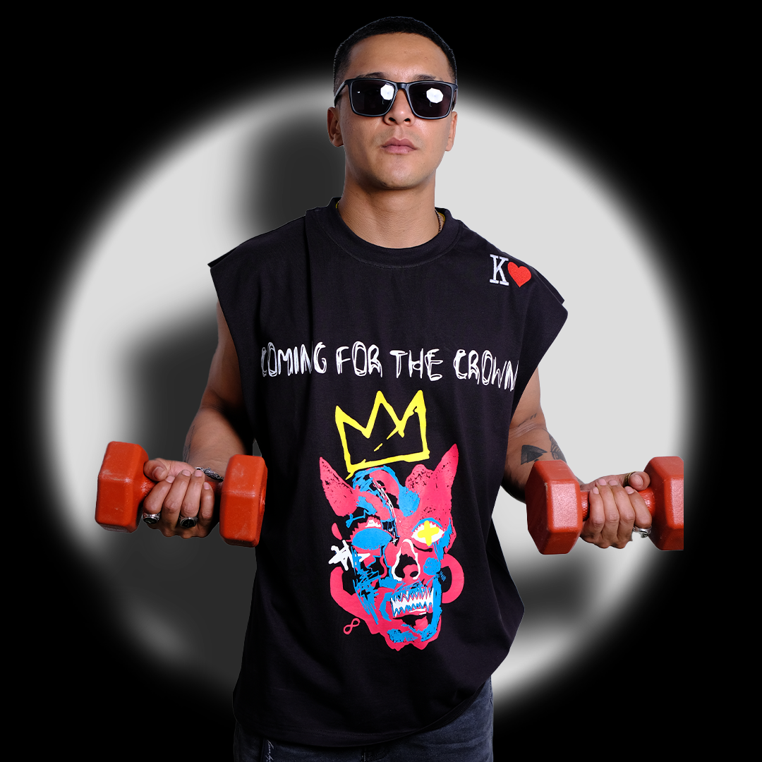 Introducing a bold and fearless tank vest designed to make a statement. This centerpiece of a design features a striking devil face at the center of the chest—complete with sharp, curved horns, cunning smirk and intense eyes, symbolizing rebellion and power. Resting just above the devil’s head is a minimal gold crown, representing dominance, ambition, and the unrelenting chase for greatness. The design blends dark streetwear aesthetics with a regal twist, making it perfect for those who walk their own path.