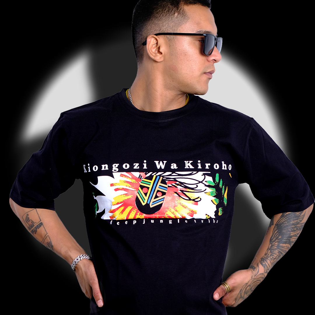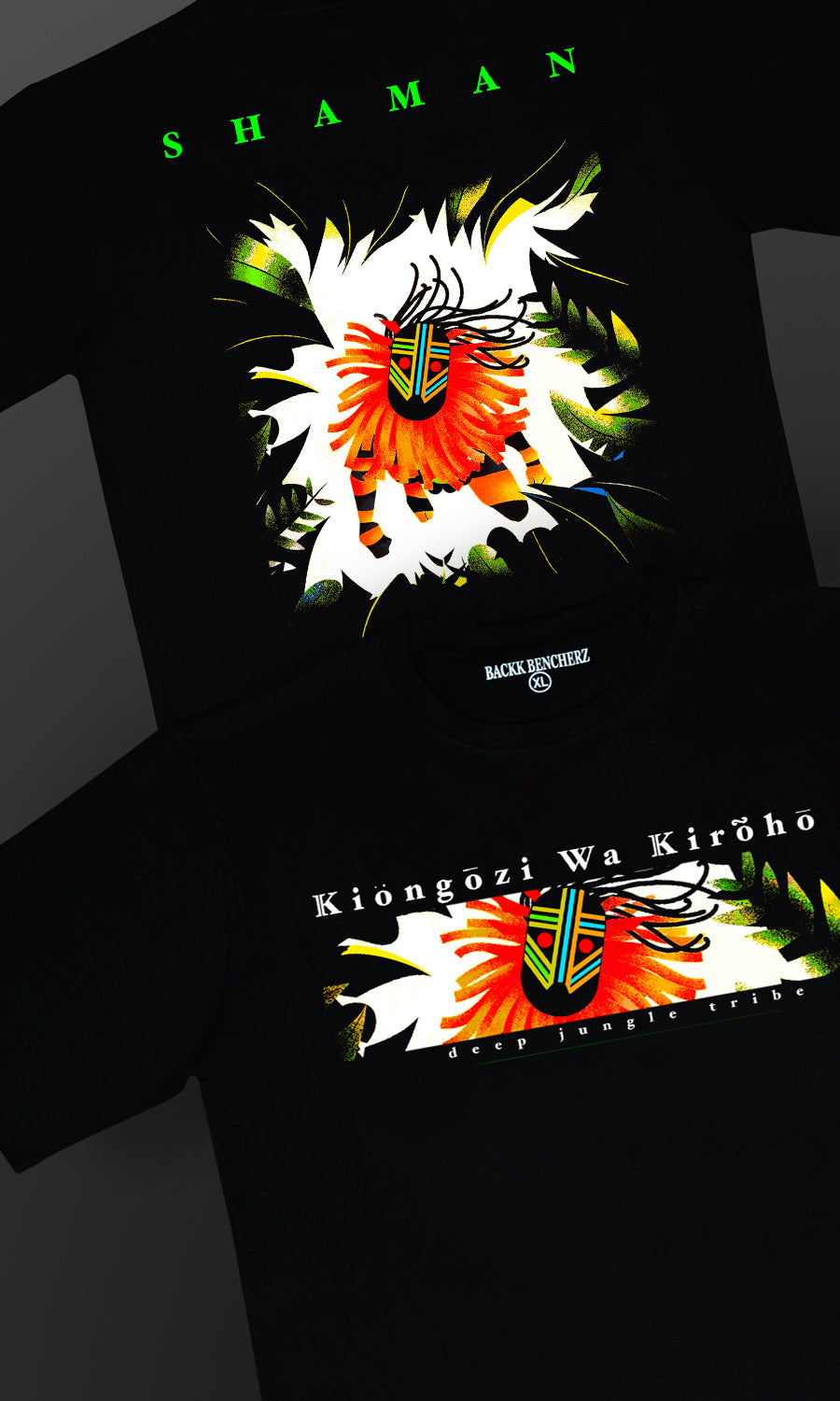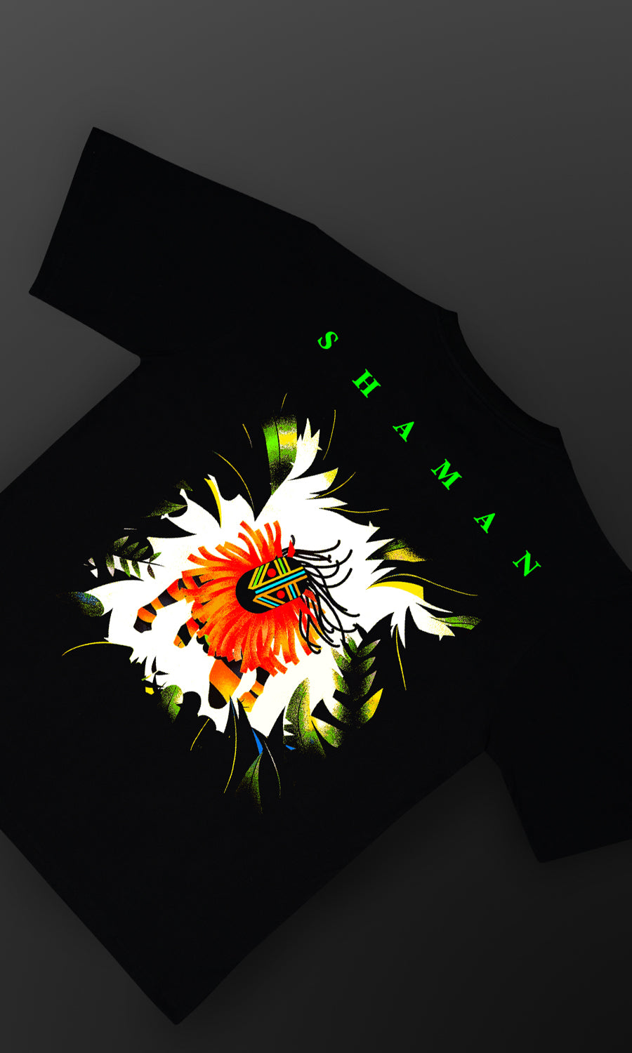 In the design of the t-shirt, the jungle itself emerges as a central motif, with lush foliage, exotic flora, and hidden creatures intertwining with the figure of the shaman. Vibrant colors and dynamic patterns evoke the rich biodiversity and vibrant energy of the rainforest, inviting wearers to immerse themselves in its majesty and mystery. With each wear, the t-shirt becomes a portal to the untamed beauty of the jungle and a reminder of humanity's interconnectedness with the natural world.