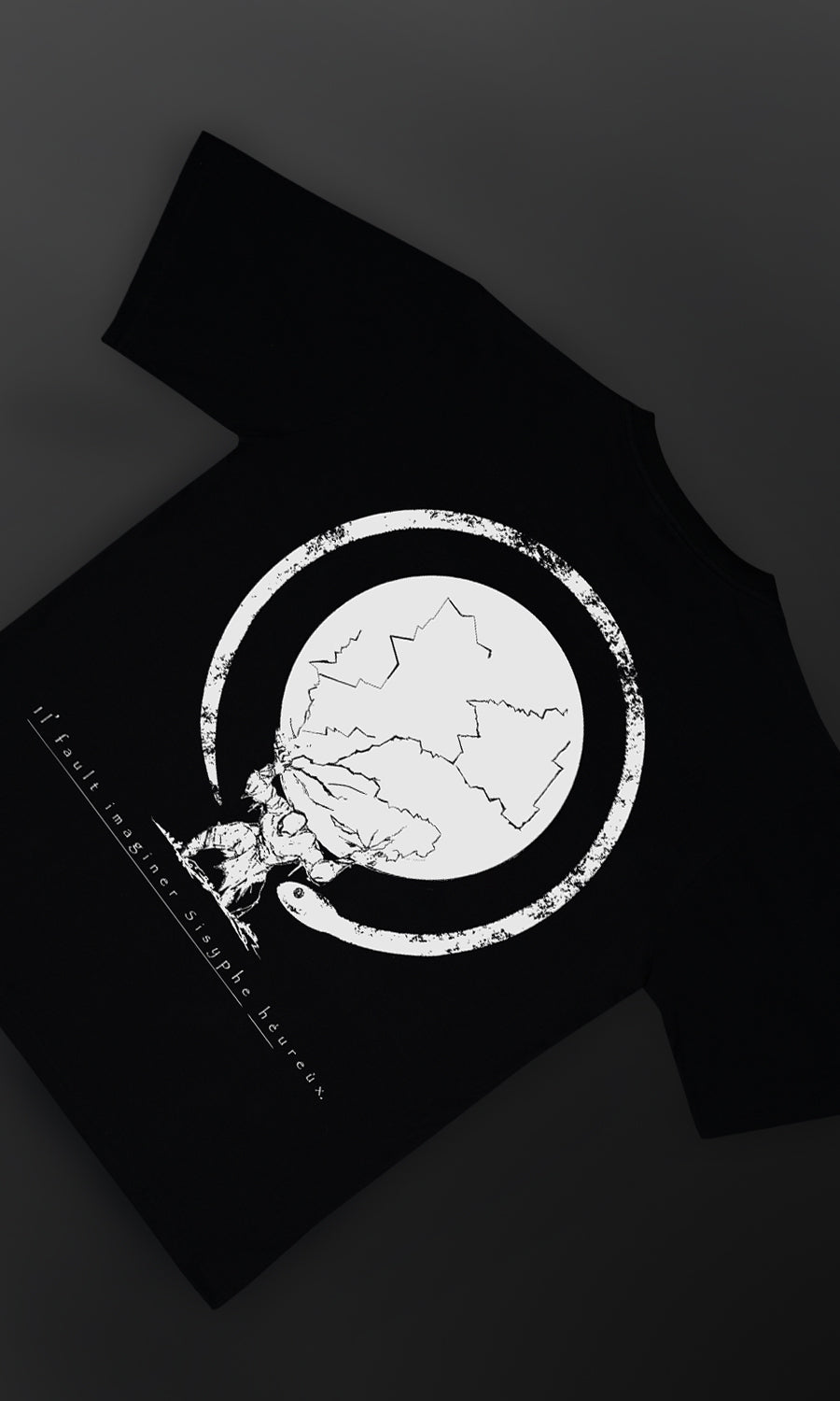 In Greek mythology, Sisyphus is condemned to an eternity of pushing a boulder uphill, only to have it roll back down each time he nears the summit—an endless cycle of struggle and futility. Yet, despite his seemingly futile task, Sisyphus perseveres, finding meaning and purpose in the act itself. Now, the timeless tale of Sisyphus finds new expression in a captivating t-shirt design, inviting wearers to embrace resilience and imagine happiness in the face of life's challenges.